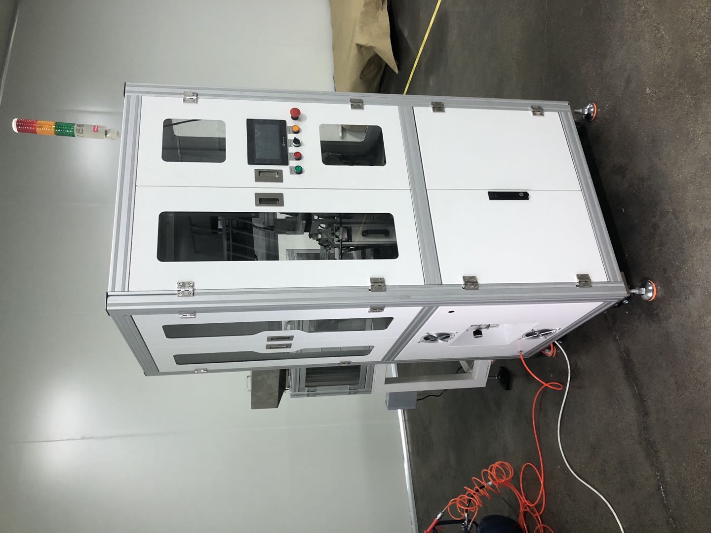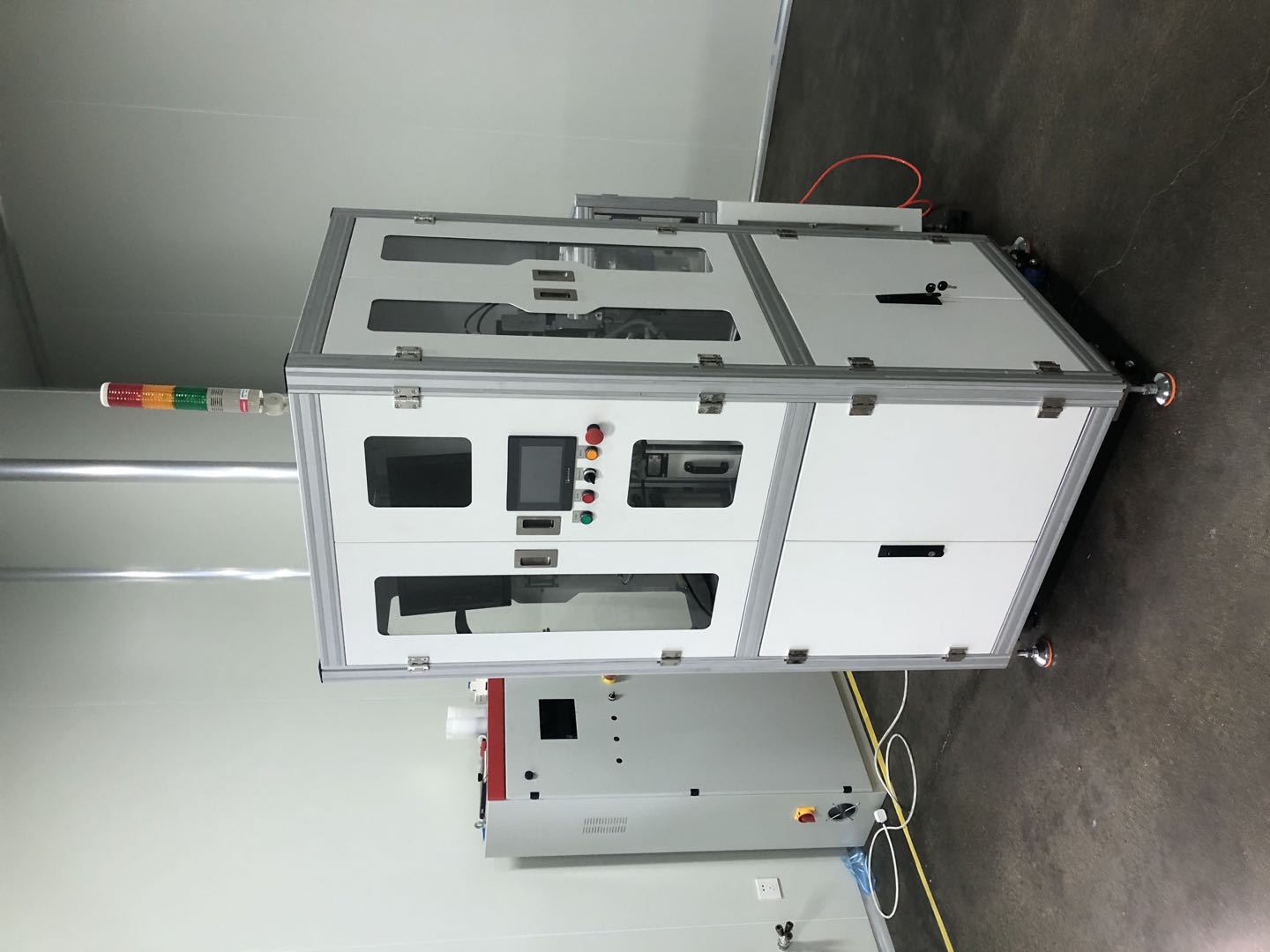 规格:长(1300mm)*宽(1600 mm)* 高(1900mm) 功率:2.5KW 气压: 0.5~0.7MPa, 用气量:200L/min 4.UPH: 2000PCS/H